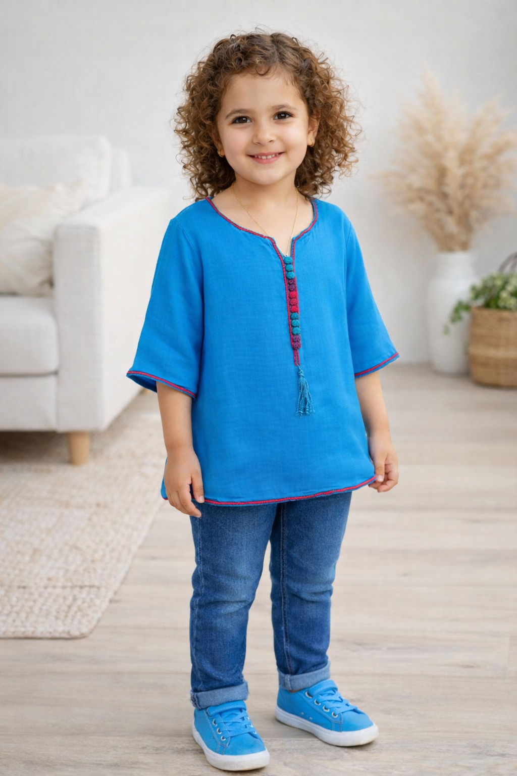 Découvrez la Tunique Féérique Bleue, un véritable bijou vestimentaire pour vos petites princesses 💙👧 ! Confectionnée en coton ultra-doux et cousue main 🧵, cette tunique associe confort, légèreté et un style irrésistible. Son bleu éclatant, rehaussé de finitions colorées et de pompons délicats 🎀, fait de cette tenue une pièce parfaite pour toutes les occasions.