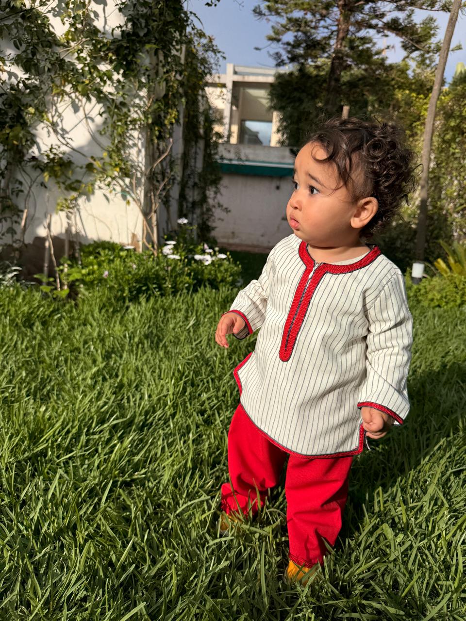 Avec son tissu en lin et coton, il offre une sensation de légèreté et de confort, parfaite pour les journées festives ou les moments en famille. Sa tunique rayée écrue et noire, rehaussée par un col et des finitions brodées en rouge vif, apporte une touche à la fois traditionnelle et audacieuse. Le pantalon rouge en coton fluide ajoute du caractère et de l’originalité à l’ensemble.