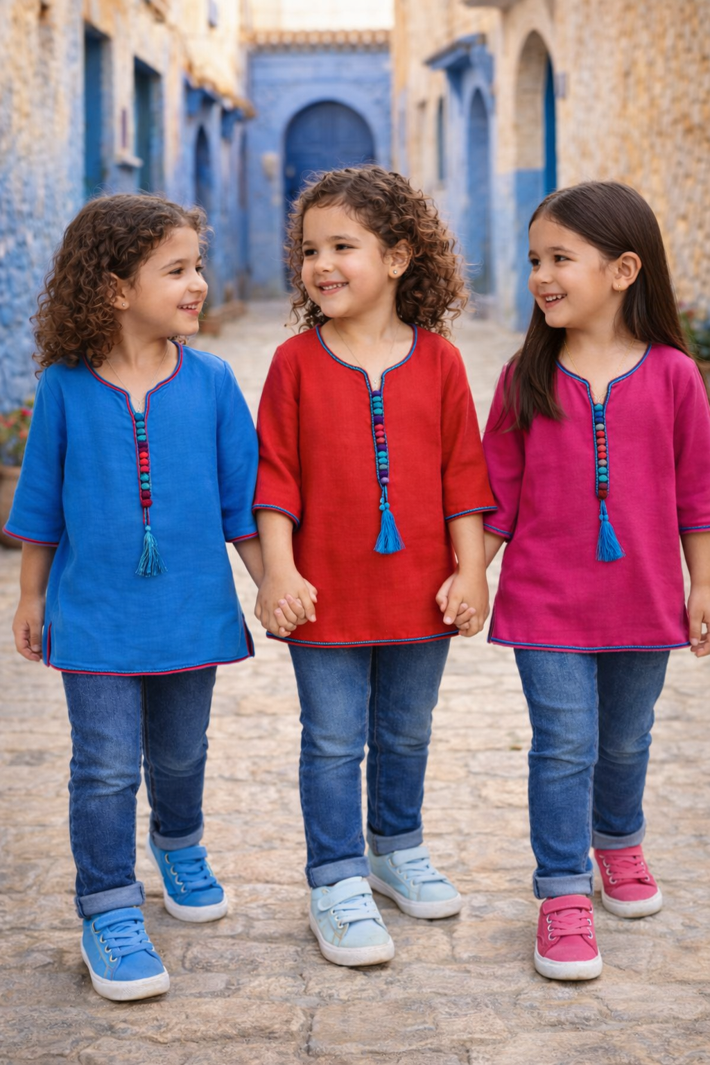 Ajoutez une touche de fraîcheur et de vitalité à la garde-robe de votre enfant avec cette tunique en coton cousue à la main, d’un rose vibrant. Conçue avec soin, elle est ornée de délicates finitions en fil bleu contrasté, offrant un look chic et moderne.